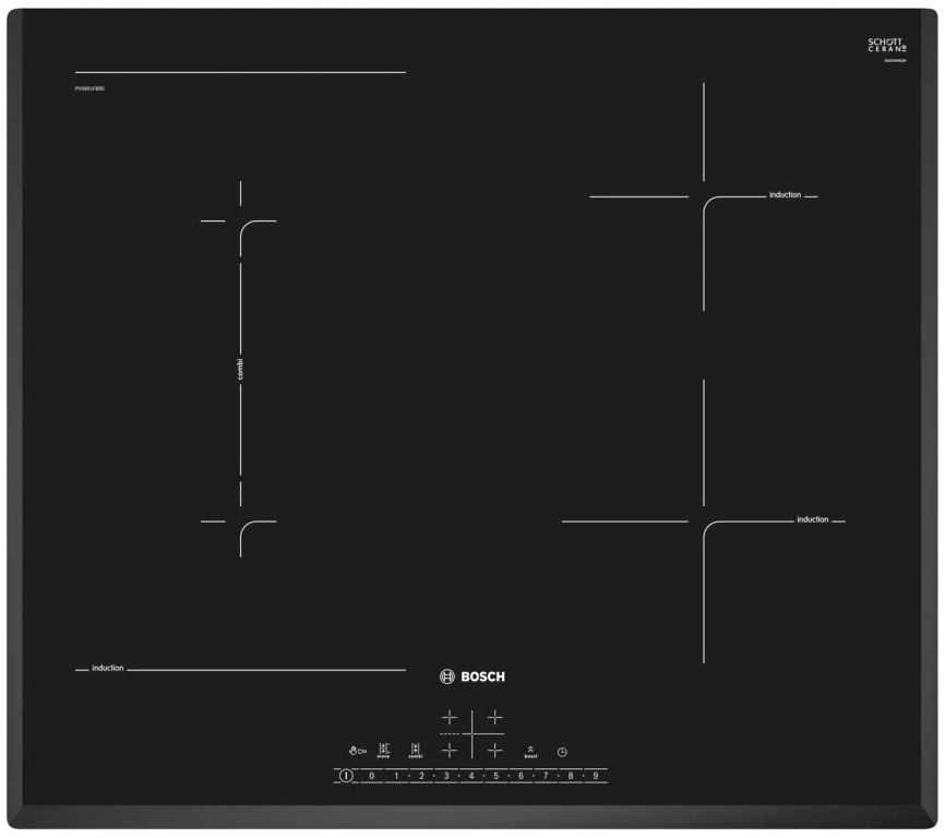 конфорка передняя левая: 190 мм, 210 мм, 2.2 кВт (макс. мощность 3.7 кВт), конфорка левая задняя: 190 мм, 210 мм, 2.2 кВт (макс. мощность 3.7 кВт), конфорка задняя правая: 145 мм , 1.4 кВт (макс. мощность 2.2 кВт), конфорка передняя правая: 180 мм, 1.8 кВт (макс. мощность 3.1 кВт); 17 ступеней мощности; распознавание наличия посуды; блокировка от детей, Cleaning-пауза: кратковременная блокировка панели до 30 секунд; минимальная толщина столешницы: 16 мм, шнур питания: 110 см, кабель в комплекте; вес - 12,259 кг