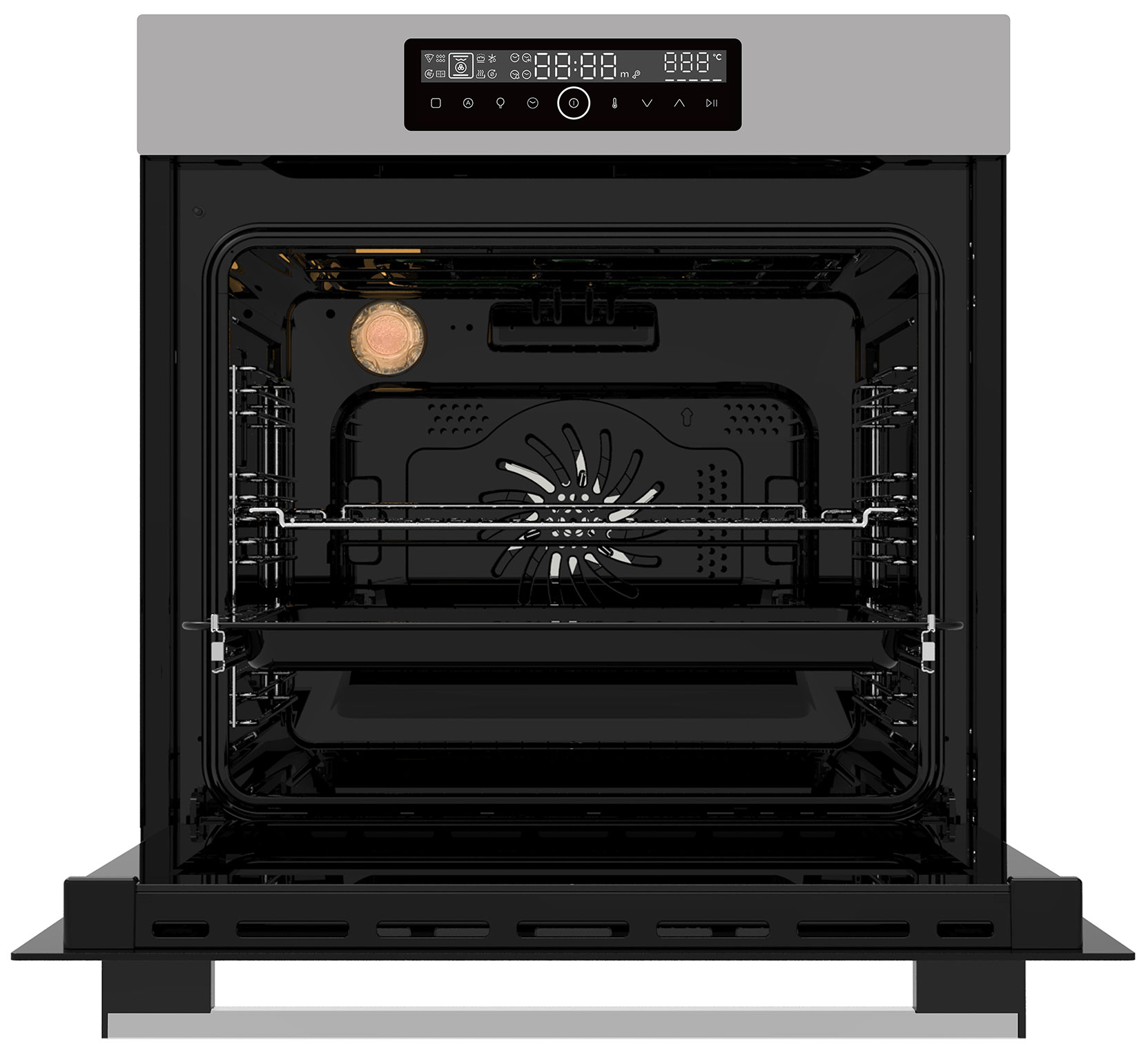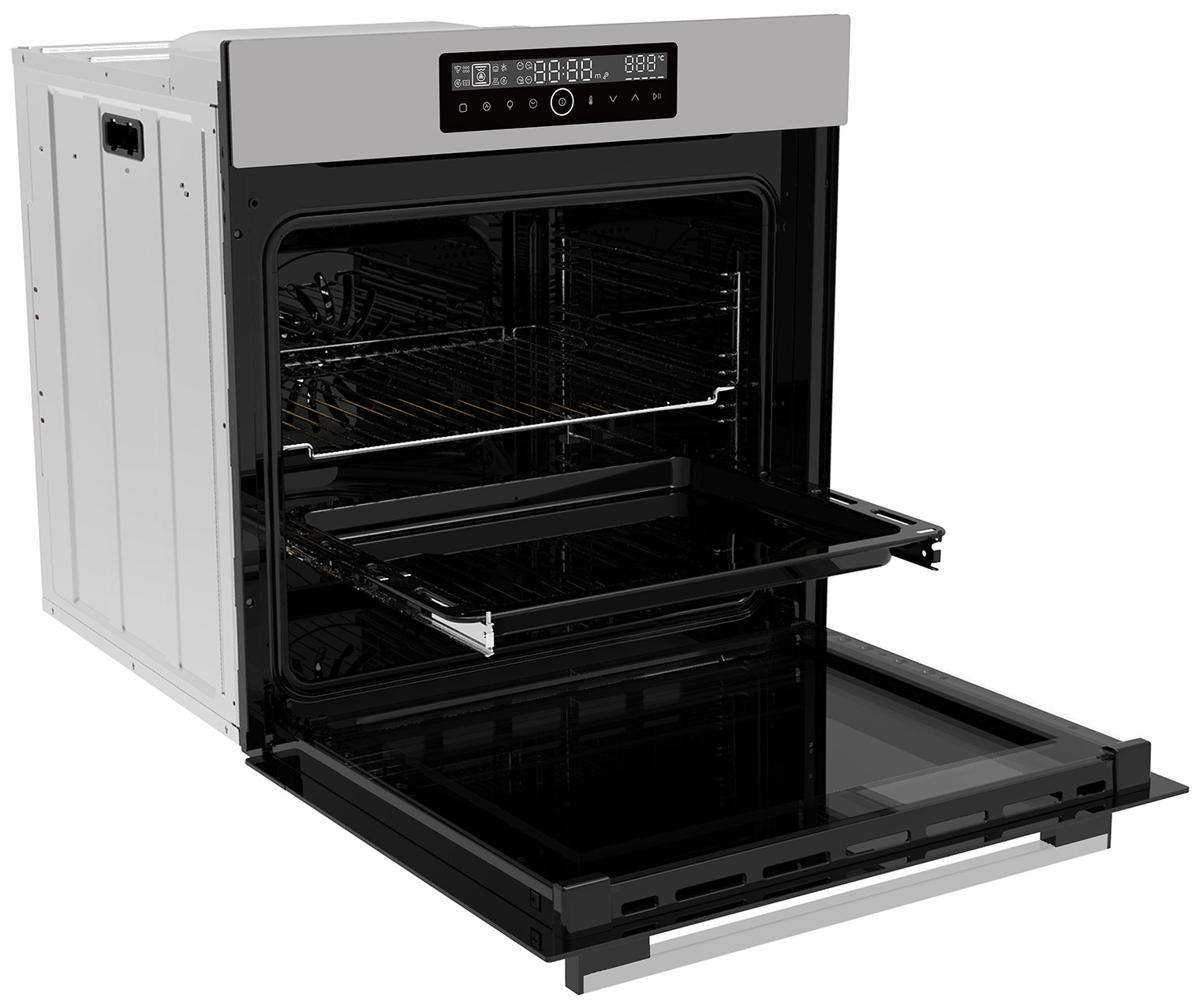 Экранное меню: пиктограммы. Таймер: звуковой. Индикация: включения, времени приготовления, режима работы. Встроенные часы. Количество уровней приготовления: 8. Подсветка духовки: галогенная. Направляющие для противней: съёмные и телескопические (на одном уровне). Дверца: съёмная. Конструкция: не нагревает дверцу, тройное стекло на дверце держит тепло и не сильно греется с внешней стороны.