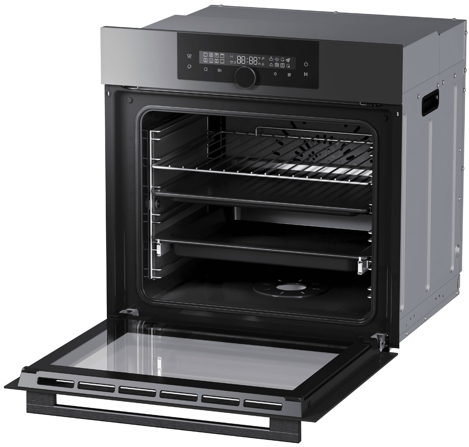 18 режимов нагрева. Среди них: приготовление с паром, нижний и верхний нагрев, конвекция, гриль, выпечка хлеба и другие. 10 автоматических программ. Среди них: подогрев, размораживание, расстойка теста, аэрогриль, пицца, сушка, приготовление в вакууме и другие. Точный контроль температуры. Специальная конструкция воздуховодов в верхней и задней части духовки в сочетании с использованием PID-алгоритма позволяет поддерживать равномерную температуру с колебанием не более, чем в 1 °C. Система очистки. Помимо специальной устойчивой эмали, модель оснащена каталитической панелью на задней стенке. А специальный режим Aqua Clean запустит процесс обработки паром, что значительно упростит эксплуатацию духового шкафа. Плавное закрытие дверцы. Специальные доводчики обеспечивают плавное закрытие дверцы духового шкафа для бережного использования. Прохладная дверца. Благодаря специальной конструкции вентиляции и трём стеклам с теплоотражающим покрытием, дверца духового шкафа не нагревается до высоких температур.