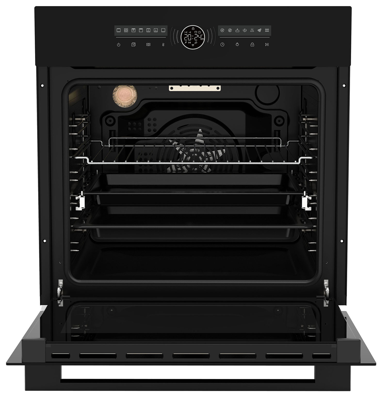 Комбинированное управление: поворотный регулятор + сенсорная панель с LED‑дисплеем. Динамическая подсветка панели управления — визуально подчёркивает статус работы. Индикации: текущей программы; режима работы; включения; температуры; времени приготовления. Цифровой таймер до 24 часов с звуковым сигналом. Подсветка элементов управления — удобна при слабом освещении. бисквит; небольшие булочки/пирожные; яичный тарт (тарталетки с начинкой); печенье; наггетсы куриные; куриные крылышки; рёбрышки. Блокировка панели управления (защита от случайных нажатий). Защита от детей — блокирует все функции. Автоматическое отключение при перегреве или длительном простое. Тройное остекление дверцы — внешнее стекло почти не нагревается, снижая риск ожогов. Вентилятор охлаждения — остужает корпус после работы. Объём камеры — 76 л, 6 уровней для размещения противней — можно готовить несколько блюд одновременно. Телескопические направляющие на 1‑м уровне — обеспечивают плавное и безопасное выдвижение противня. Паровая очистка (Aquactiva / гидролиз) — размягчает загрязнения паром для лёгкого удаления. Активное эмалевое покрытие стенок — устойчиво к царапинам и облегчает очистку. Съёмное внутреннее стекло дверцы — упрощает уход за духовкой. Съёмная дверца — позволяет тщательно очистить все труднодоступные места. Галогенное освещение (1 лампа, 25 Вт) — ярко освещает камеру, позволяя следить за приготовлением без открывания дверцы. Независимая установка — не требует привязки к варочной панели. Диапазон температур: от 30 ∘ C до 310 ∘ C. Класс энергоэффективности — A — экономичный расход электроэнергии. Мощность подключения — 3 кВт, напряжение — 220–240 В, частота — 50 Гц. Сетевой кабель длиной 1 м (без вилки).