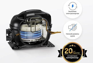 В основе этой модели лежит надёжный инверторный компрессор, который потребляет до 40% меньше электроэнергии по сравнению с обычными аналогами. Он автоматически регулирует мощность, плавно подстраиваясь под текущую нагрузку, что обеспечивает тихую работу и сокращает износ механизмов. Производитель подтверждает надёжность компрессора 21-летней сертификацией и предоставляет на него расширенную гарантию сроком на 20 лет.