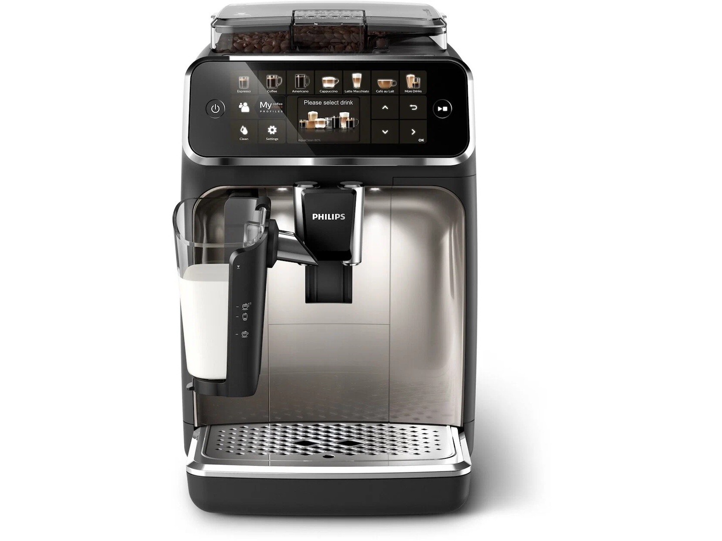 Кофемашина Philips EP5447 LatteGo оснащена встроенной кофемолкой с керамическими жерновами и возможностью настройки степени измельчения (12 позиций жерновов). Выбор напитка и настройка особенностей его приготовления выполняется с помощью интуитивно понятной электронной системы управления. Возможна отдельная подача молочной пены и горячей воды для заваривания чая. Емкости резервуара для воды (1,8 л) и контейнера для кофе (275 г) достаточно на 30-36 порций эспрессо.